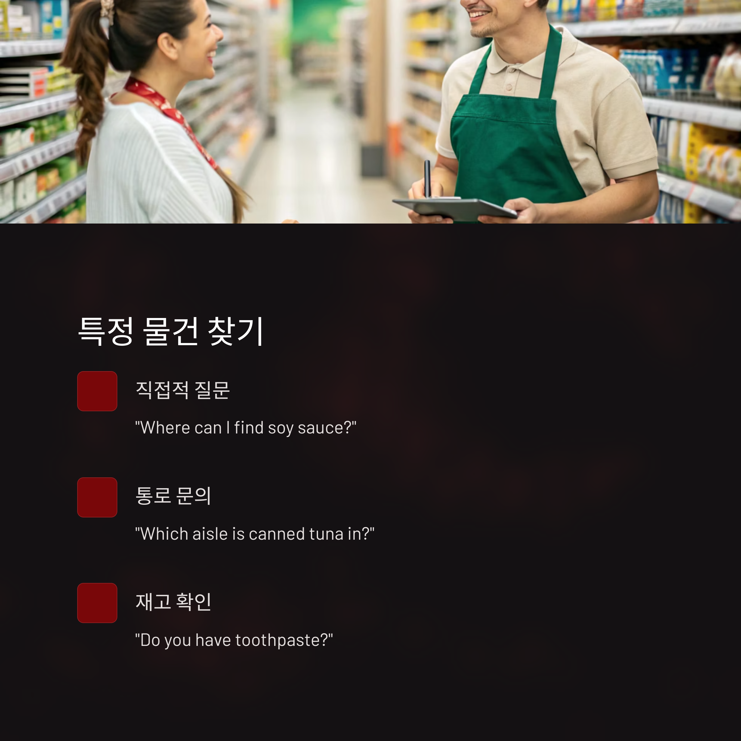 | on the bottom shelf, across from the dairy section | I’m looking for…, Do you know where…? | red pepper paste, tofu, snacks |
