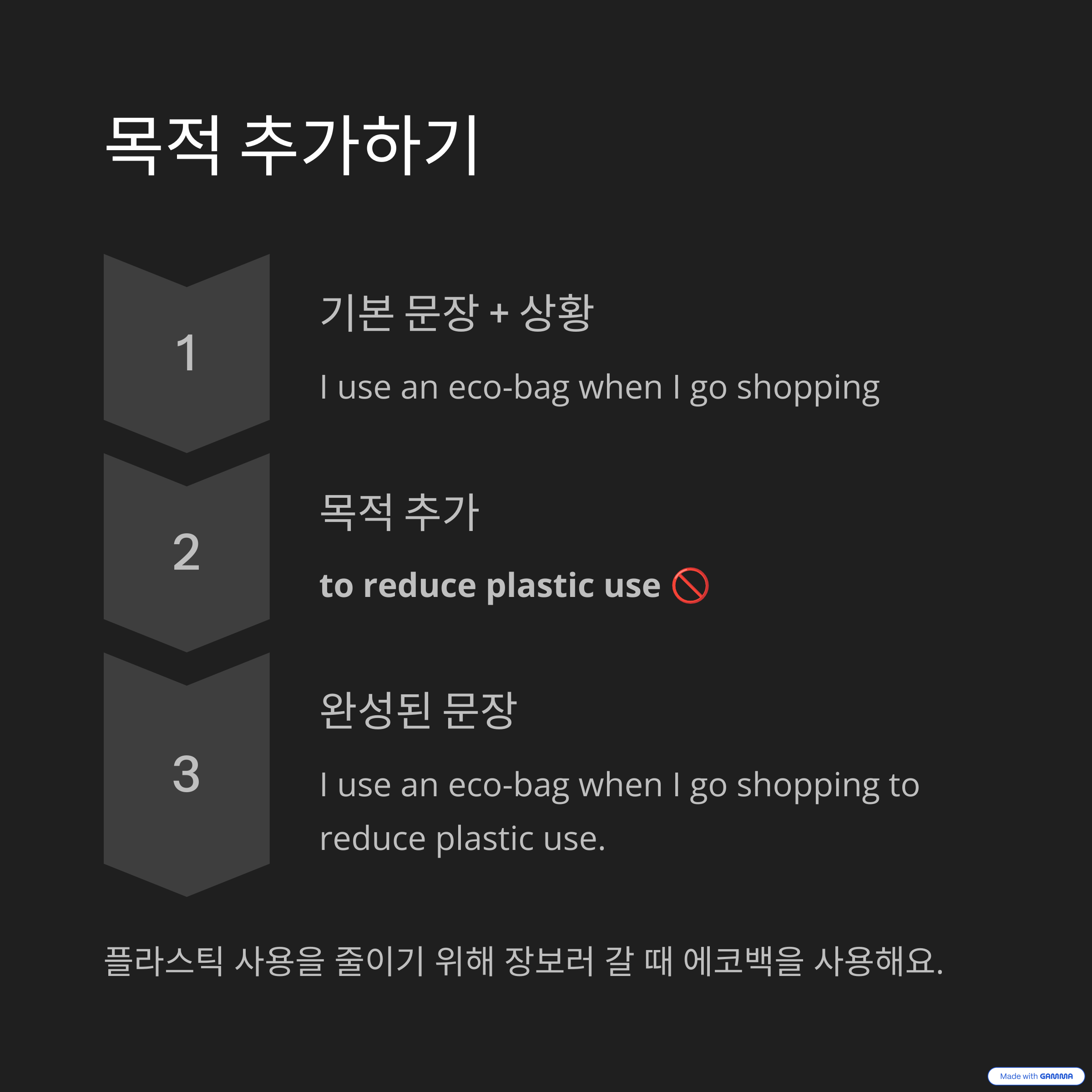 | 기본 문장 | 상황 추가 | 목적 추가 |