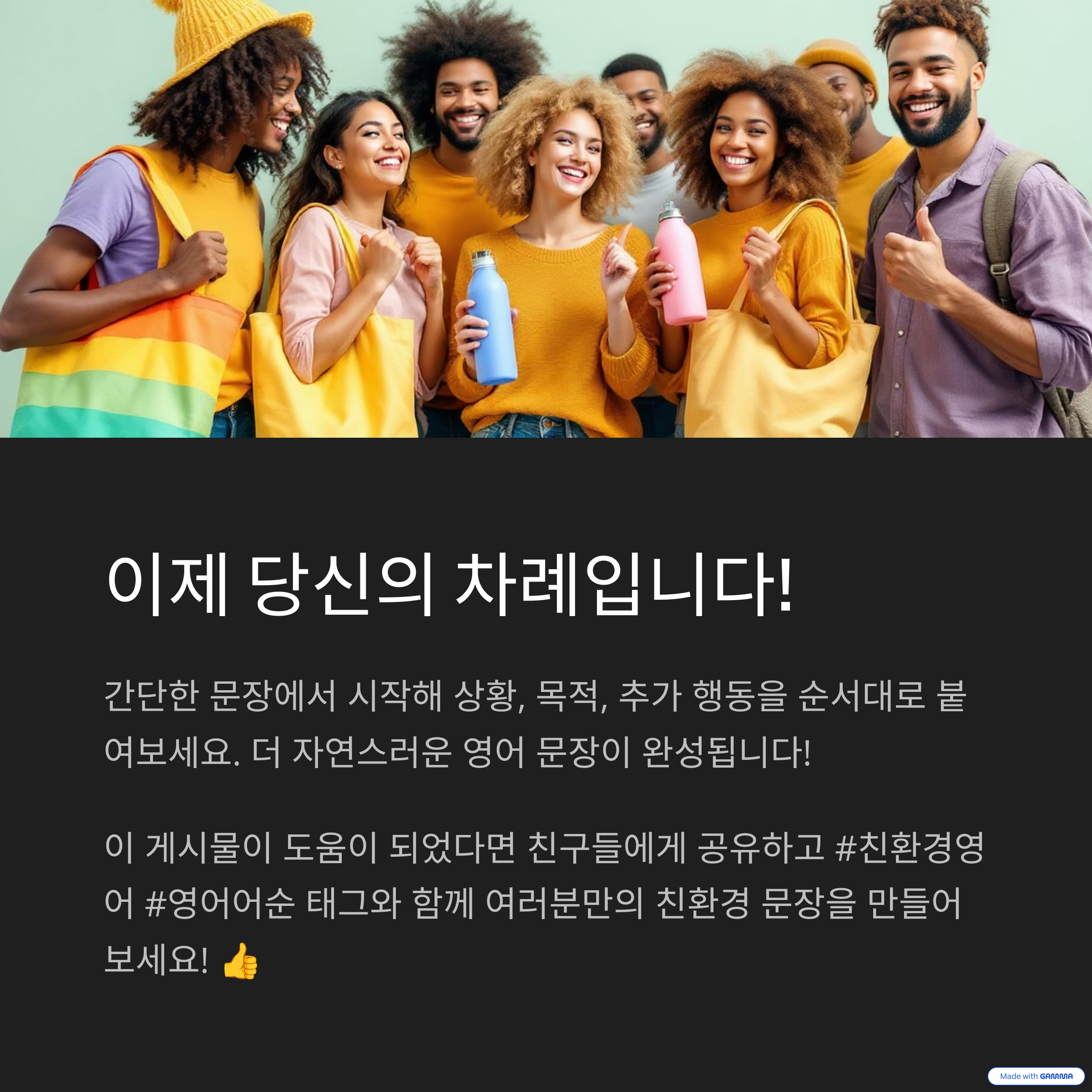 어순 영어 확장의 핵심은 정보 추가입니다. 예를 들면, "I use an eco-bag when I go shopping." 이렇게 '언제'라는 상황을 추가해 줍니다. 이어서 "to reduce plastic use"라는 목적을 추가하면 문장이 더욱 풍부해집니다. 최종적으로 "and think of the environment" 같은 추가 행동까지 연결하면 매우 자연스럽고 완성도 높은 영어 문장이 됩니다. 이런 흐름을 익히는 것이 중요합니다.