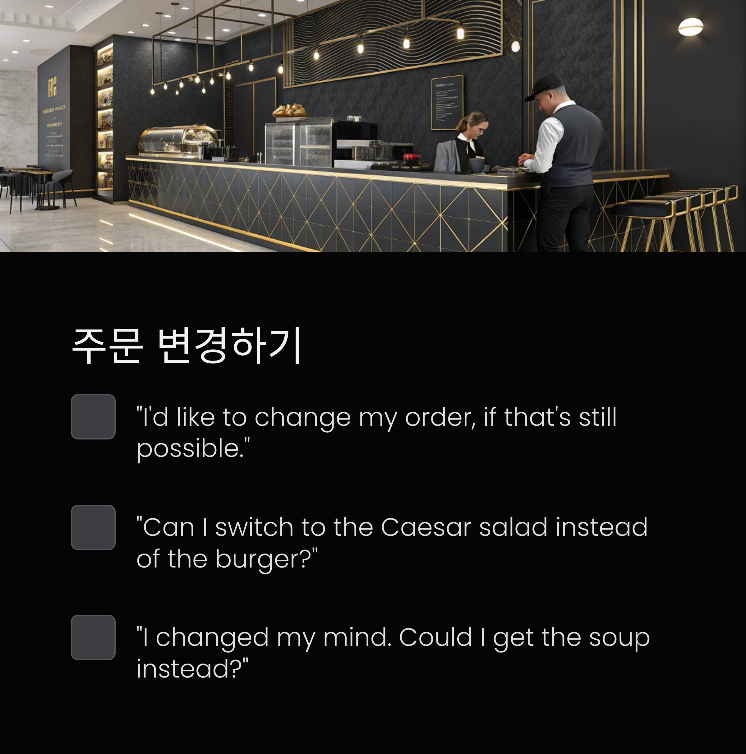 변경 요청 | "Could I change my order to something else, if it’s not too late?" |