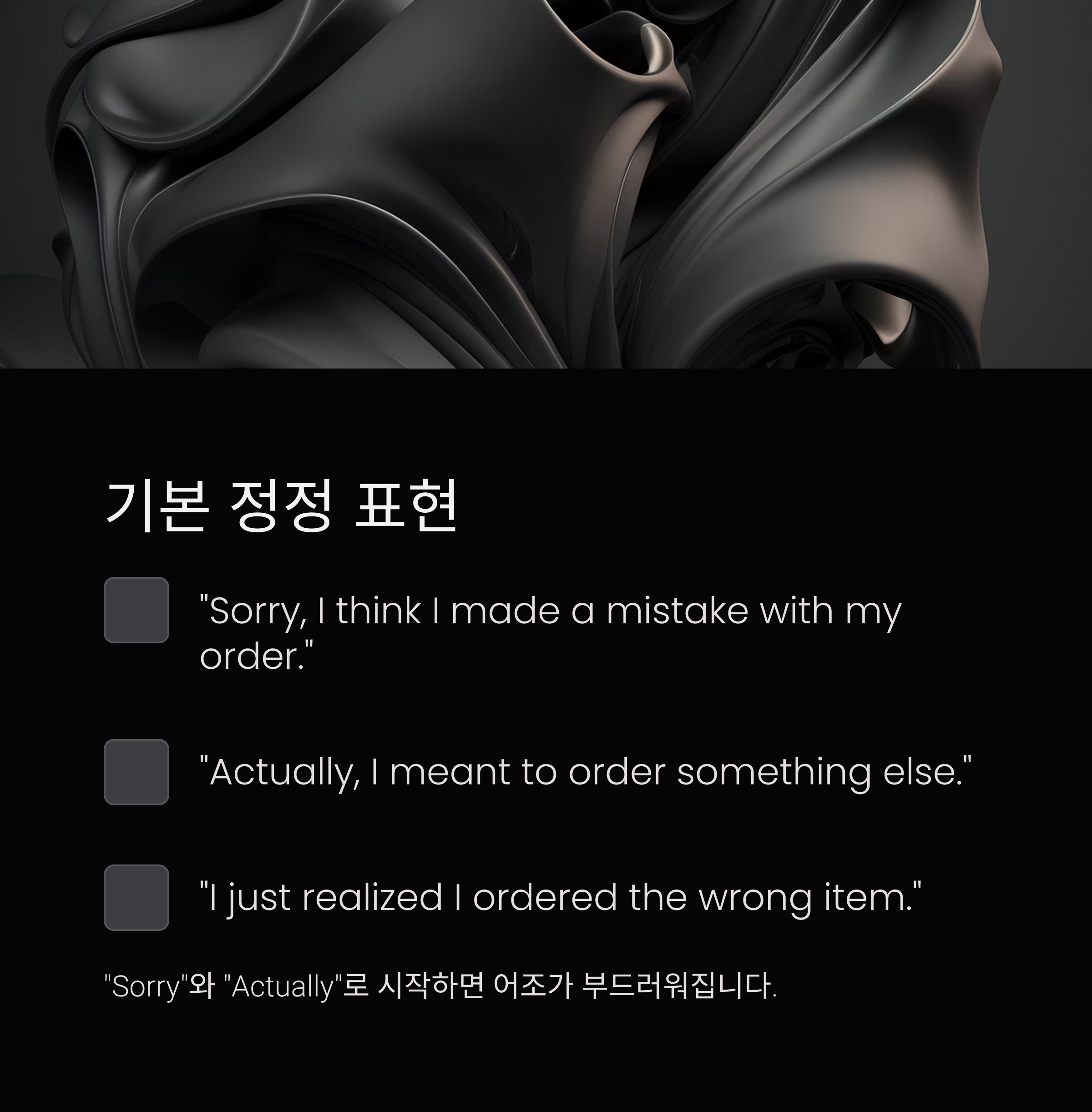 핵심: "Sorry"와 "Actually"는 정정 시 어조를 부드럽게 해줍니다.