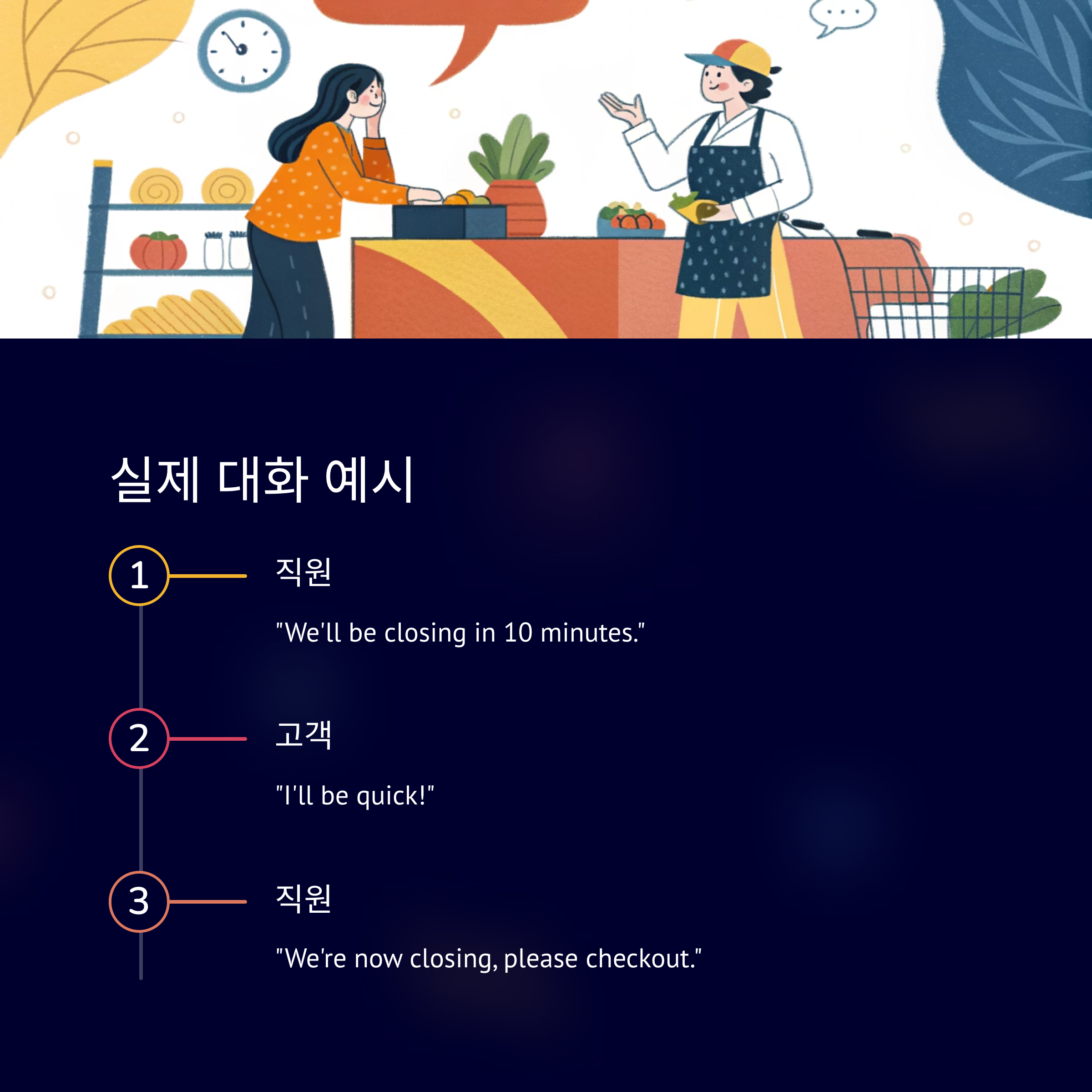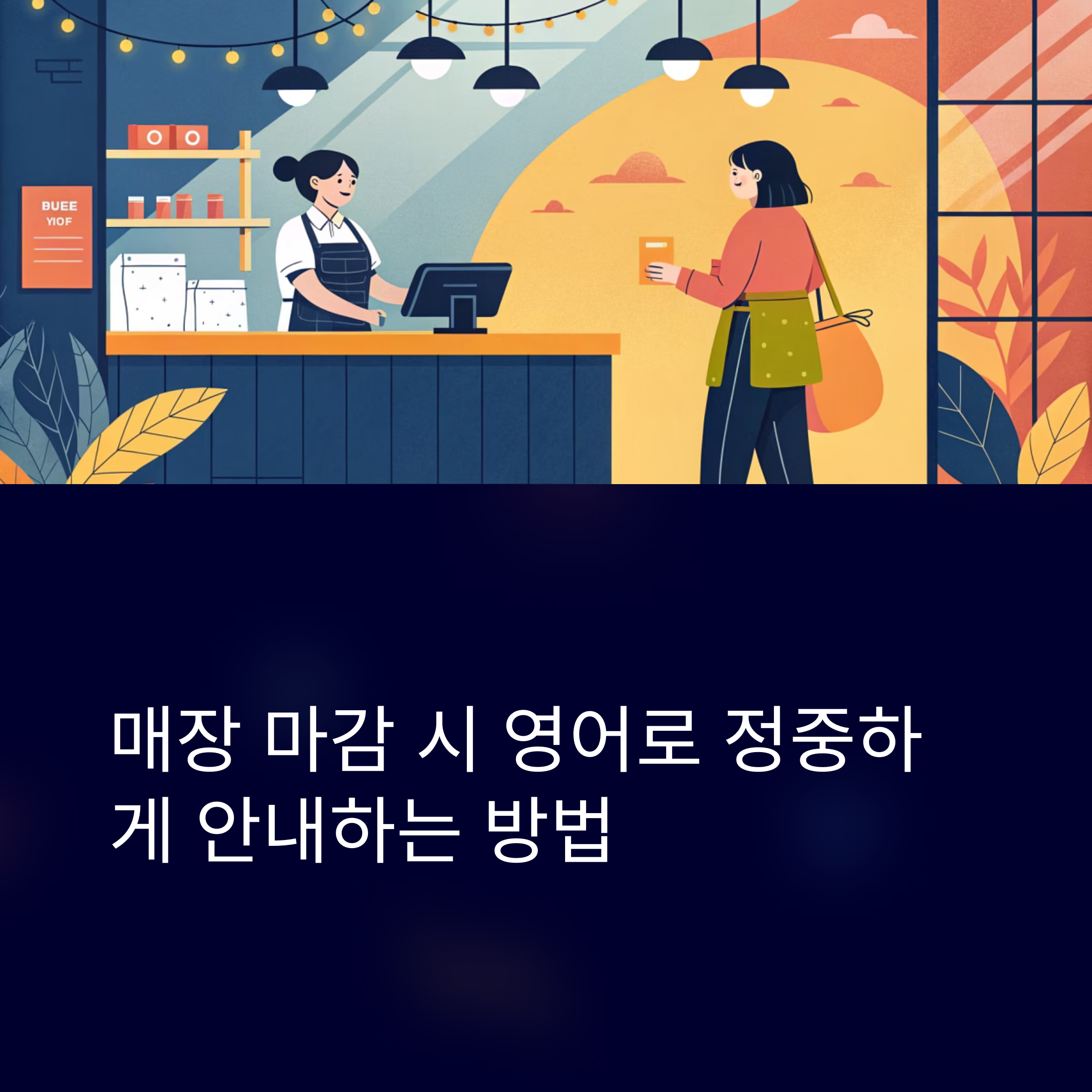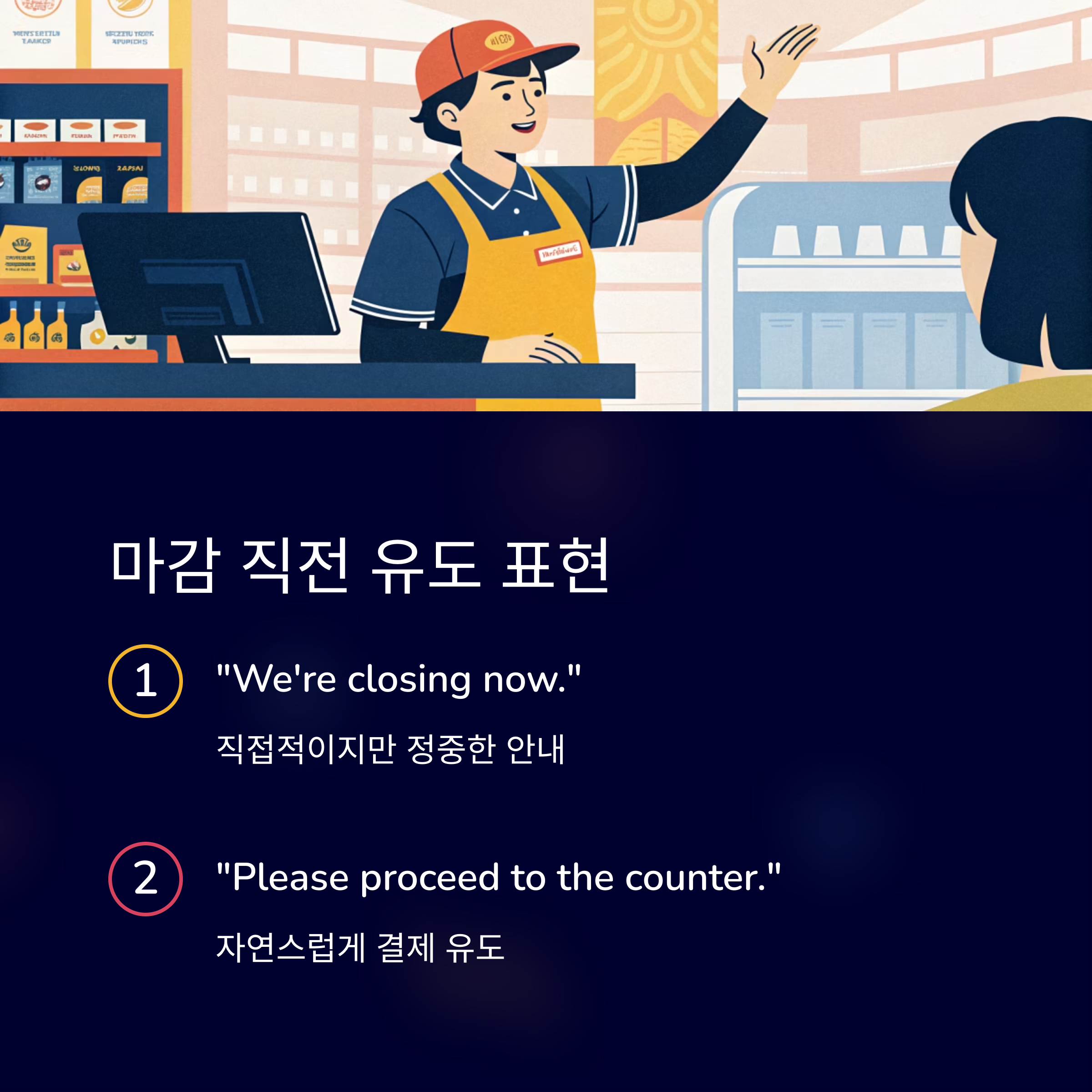 핵심 표현은 "we’re closing now", "we’re about to close", "please proceed to the counter" 등입니다. 고객에게 부담을 주지 않으면서 자연스럽게 결제를 유도할 수 있습니다.