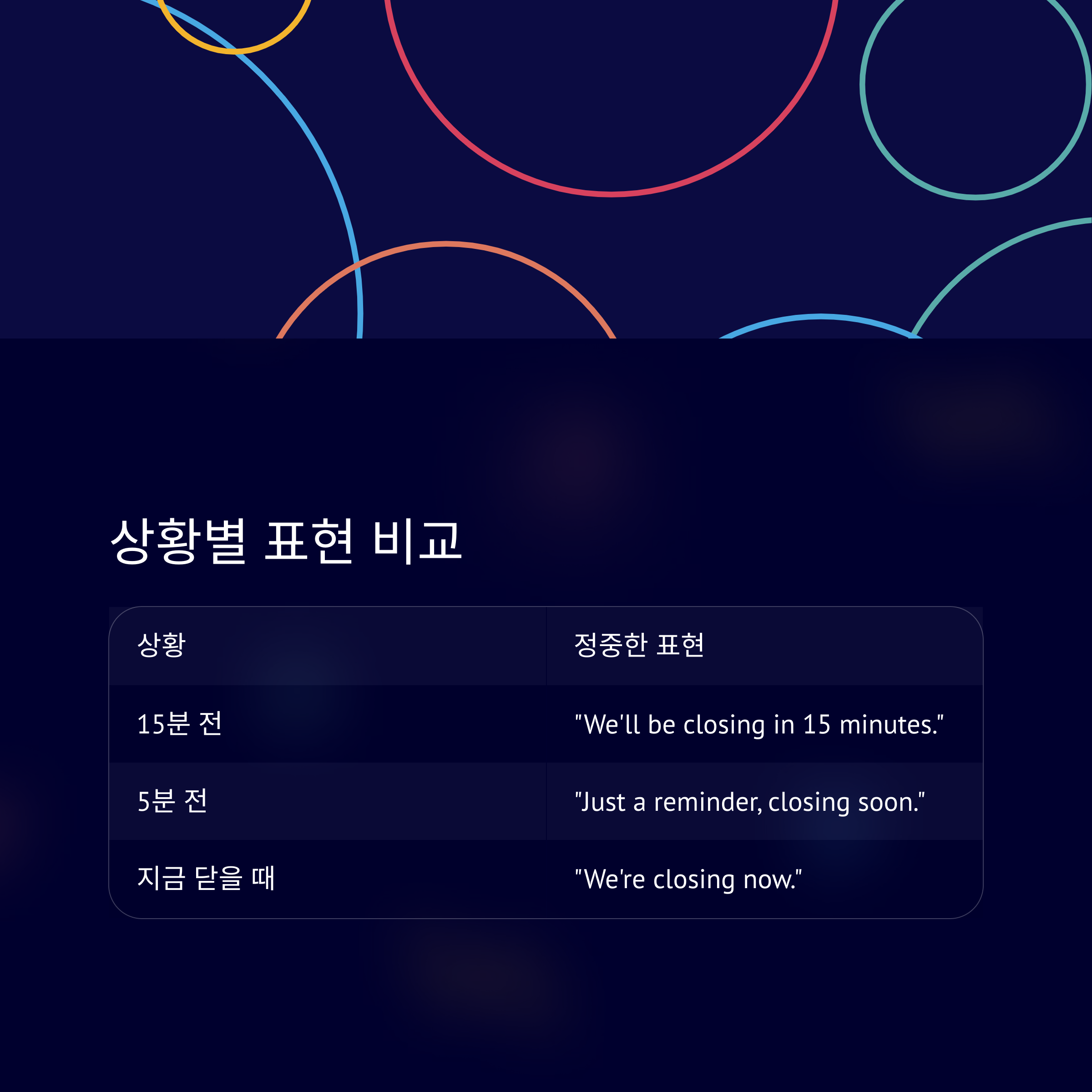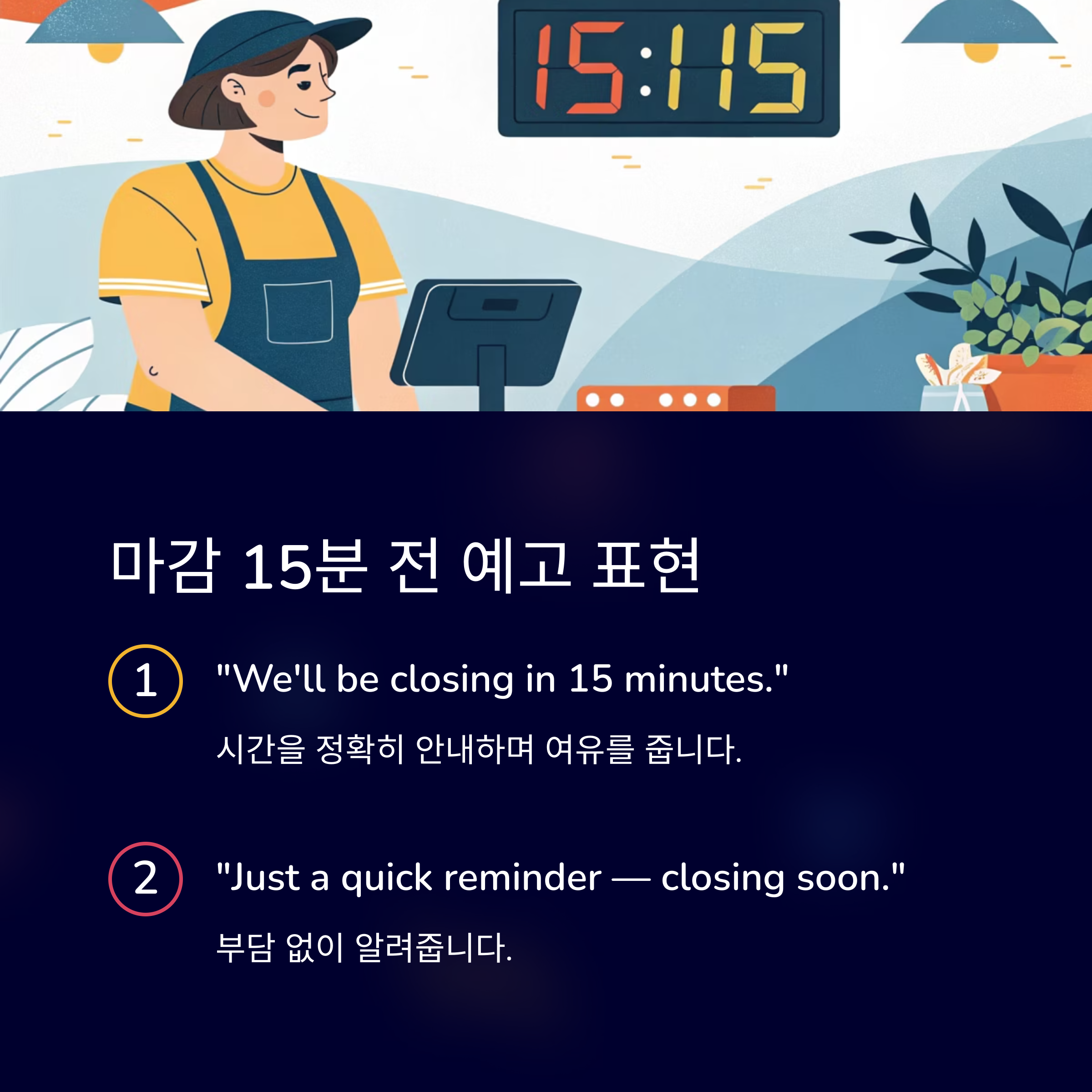 | 문 닫기 15분 전 | We’ll be closing in 15 minutes. | 예고 중심, 여유 줌 |