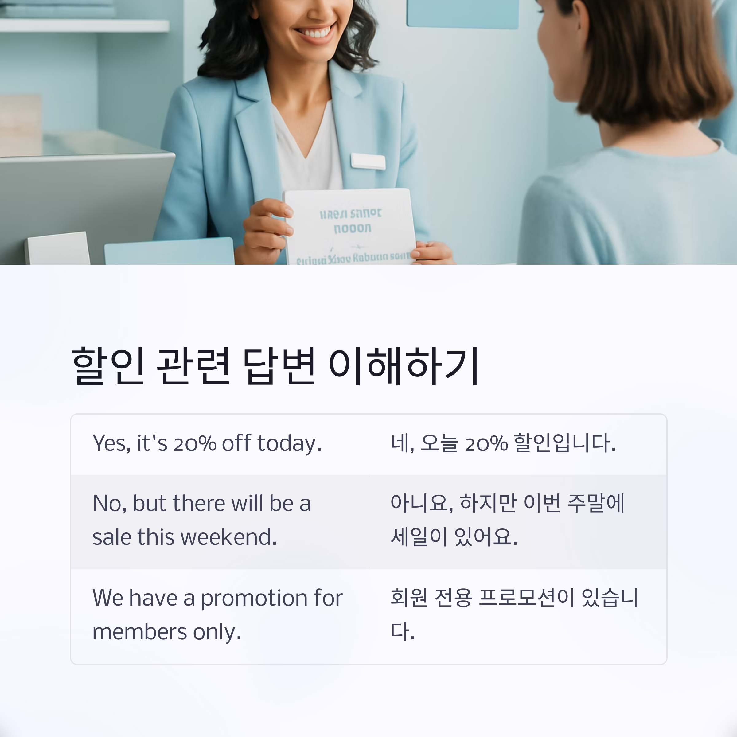 "오늘 할인하나요?"는 쇼핑 상황에서 꼭 필요한 질문입니다.