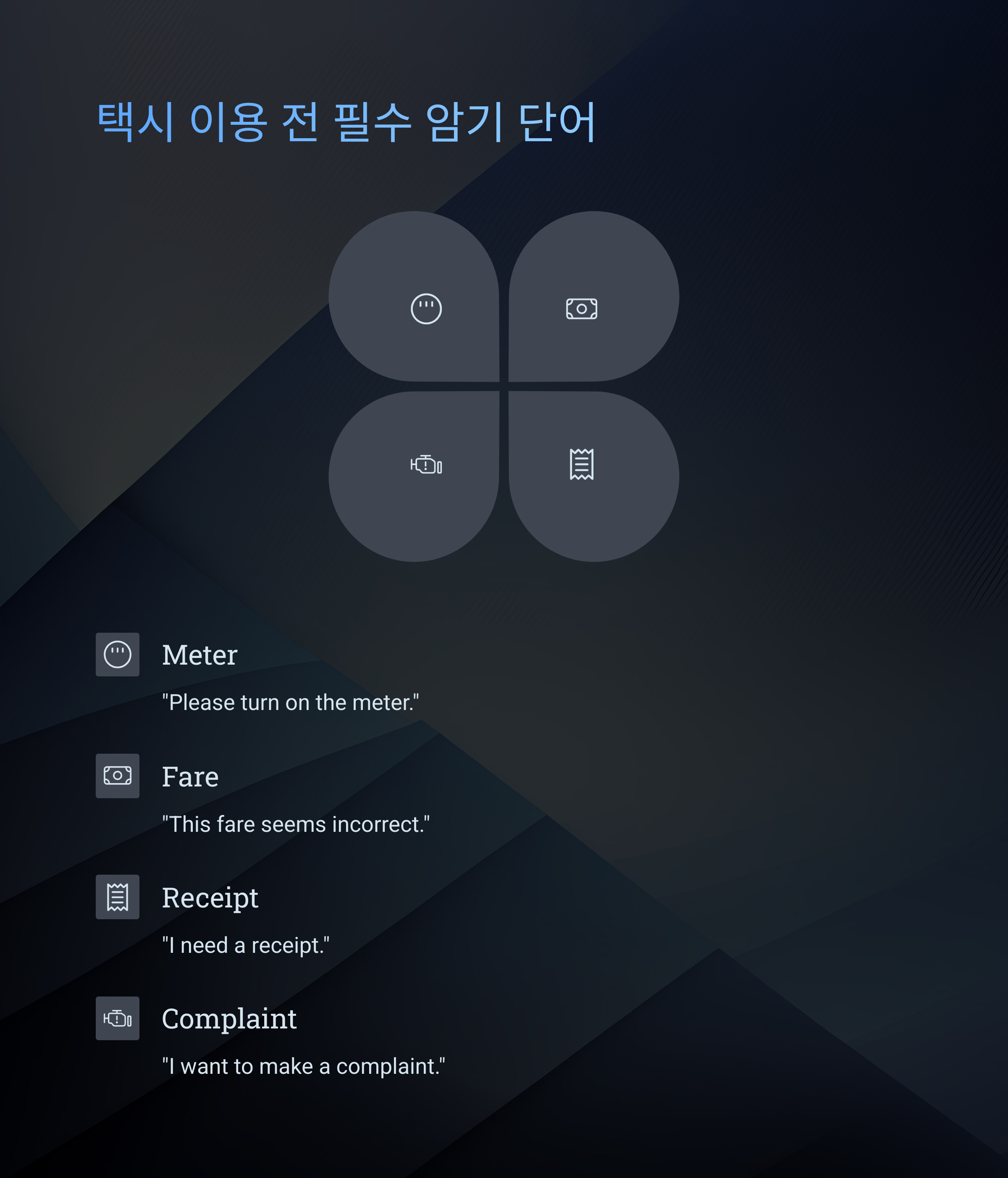 "Meter, Fare, Receipt, Complaint" 이 4단어만 기억해도 대부분의 문제 상황에 대처할 수 있습니다.