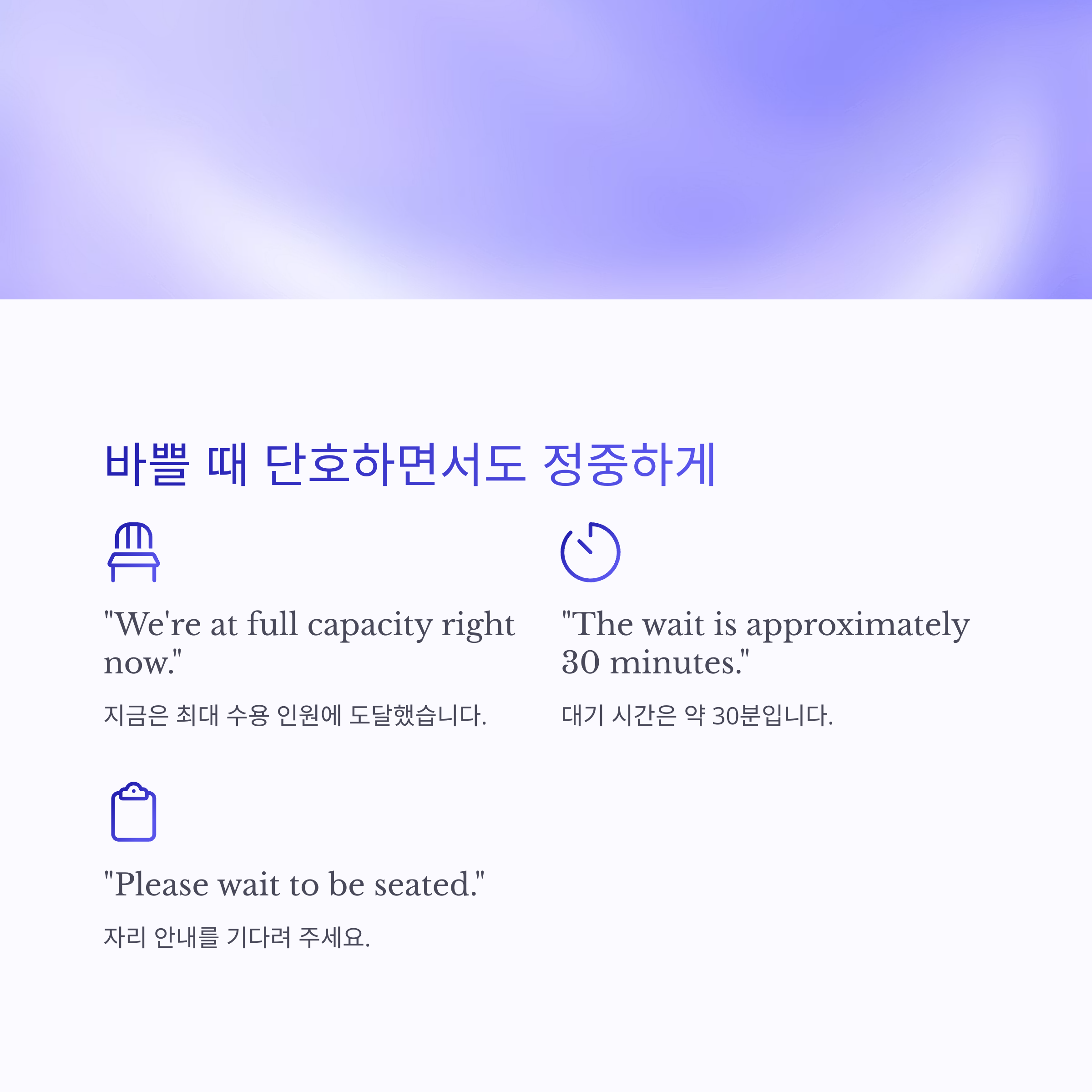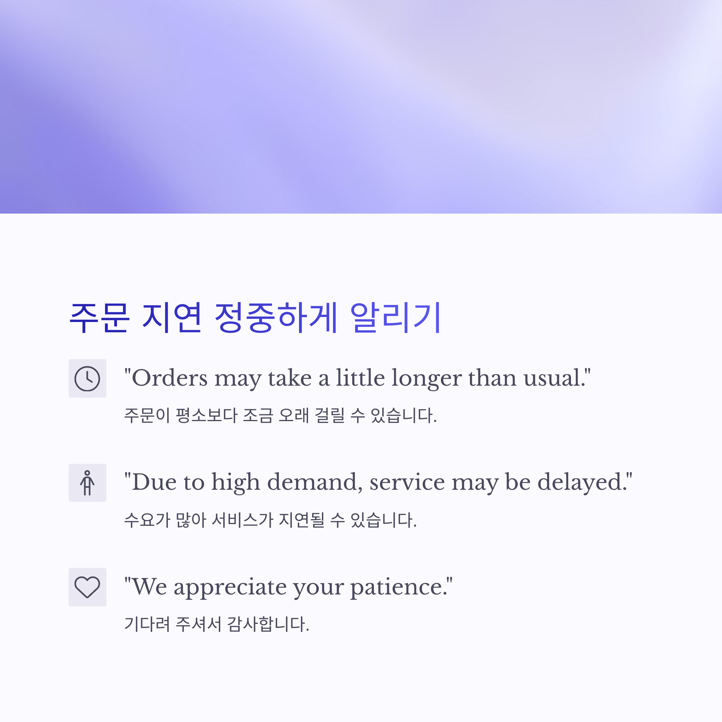예를 들어, 손님이 줄을 서 있는 상황에서는 "There are a few parties ahead of you. We’ll call you in order."와 같이 안내와 순서 보장이 담긴 문장이 효과적입니다. 반면 주문이 밀려 서비스가 지연되는 경우에는 "Orders may take a little longer than usual. We appreciate your patience." 와 같이 양해와 감사 표현을 결합한 문장이 적절합니다. 이런 문장들은 단순한 통보가 아닌 신뢰의 커뮤니케이션입니다.