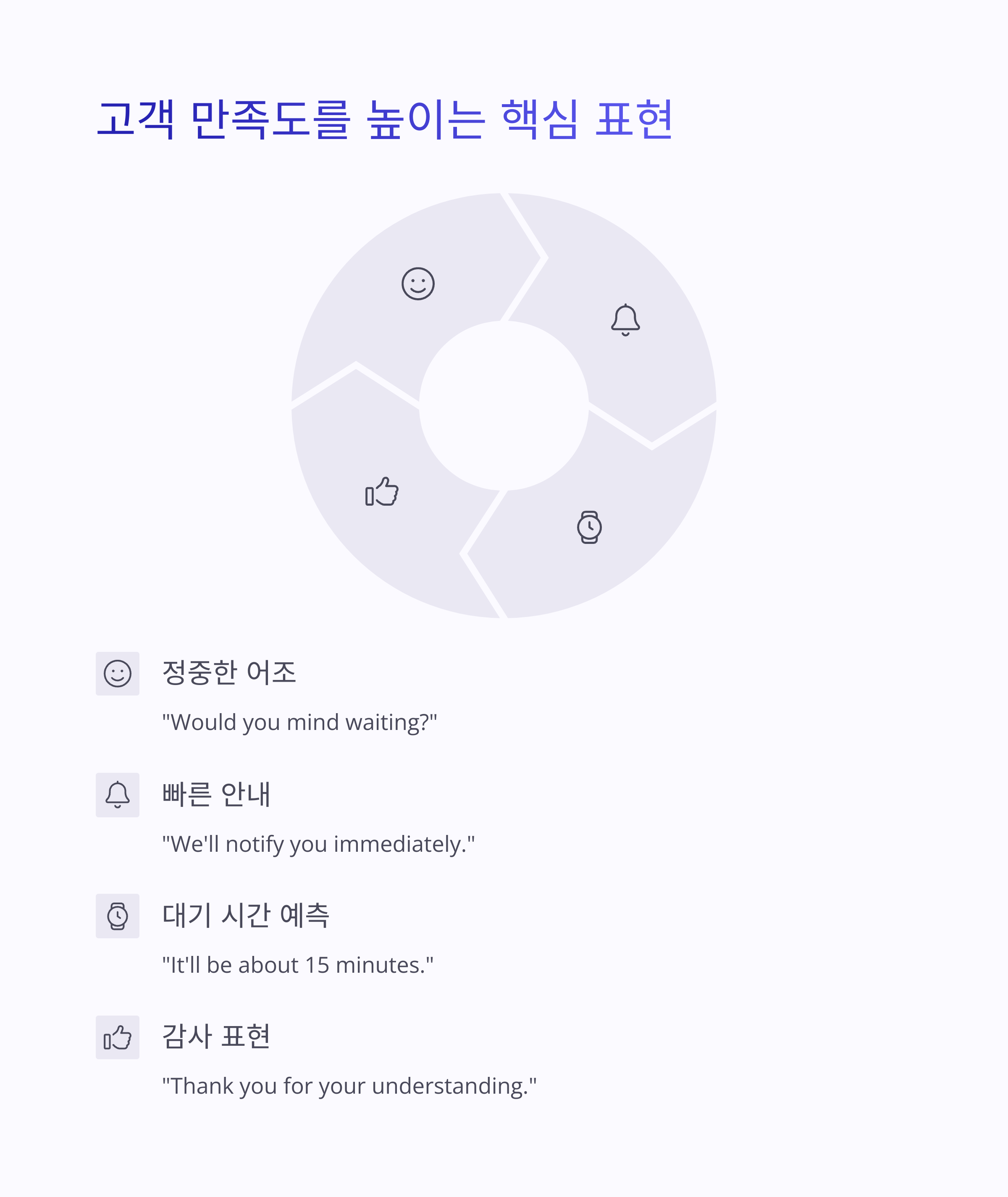 대기 요청 시 가장 중요한 요소는 톤과 태도입니다. "Would you mind waiting for a moment?"처럼 완곡한 표현은 고객이 느끼는 불편함을 줄이고 서비스에 대한 신뢰와 만족도를 향상시킵니다. 매장의 분위기와 고객 성향에 맞는 표현을 선택하여 고객이 불쾌함 없이 대기할 수 있도록 응대하는 것이 중요합니다.