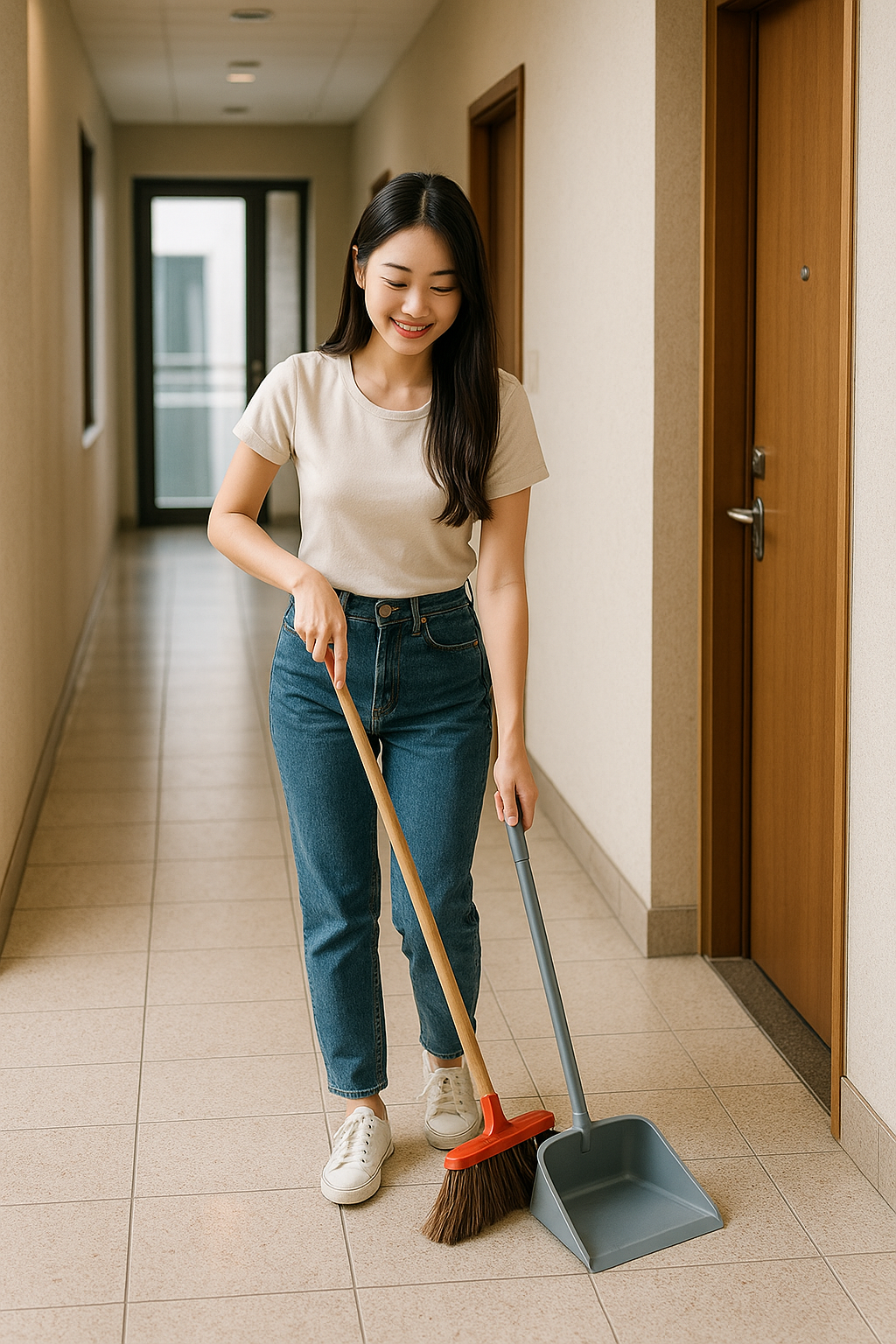 | sweep (쓸다) | in the hallway (복도에서) | quietly (조용히) |