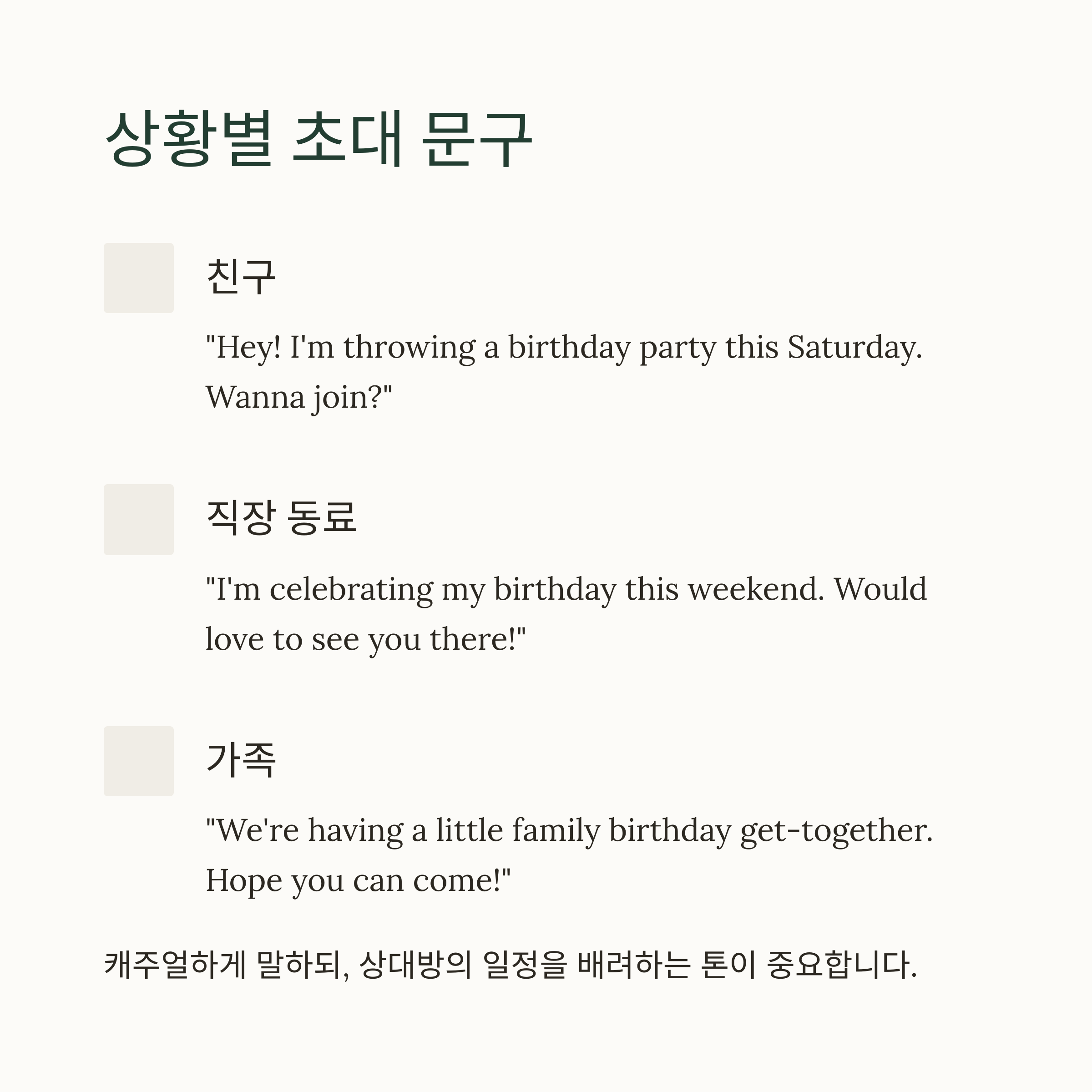 초대뿐 아니라 상대방 생일을 축하하는 인사도 자연스럽게 표현하는 게 중요합니다.