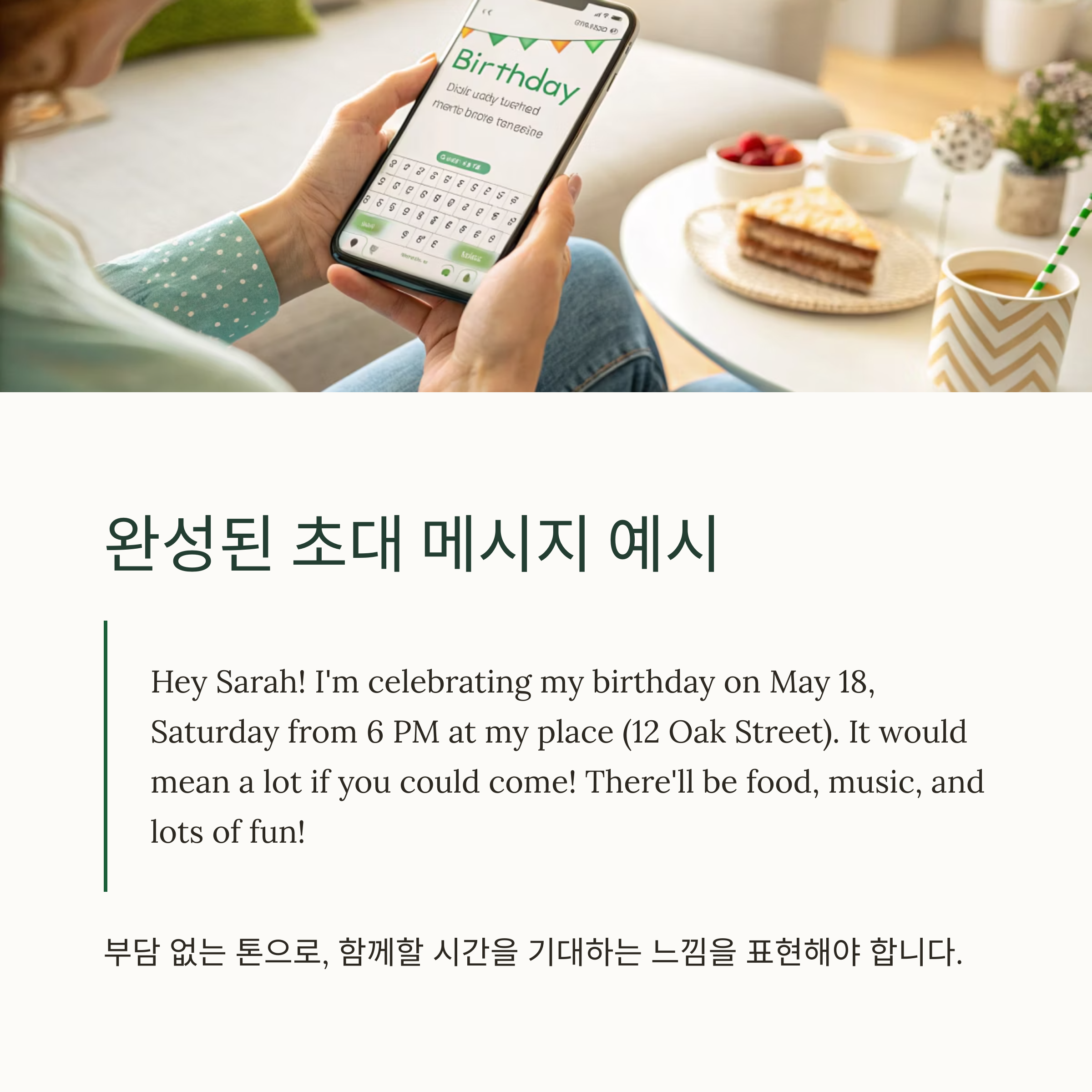 생일 초대 메시지는 격식을 차리기보다는 따뜻하고 진심이 담긴 표현이 중요합니다.